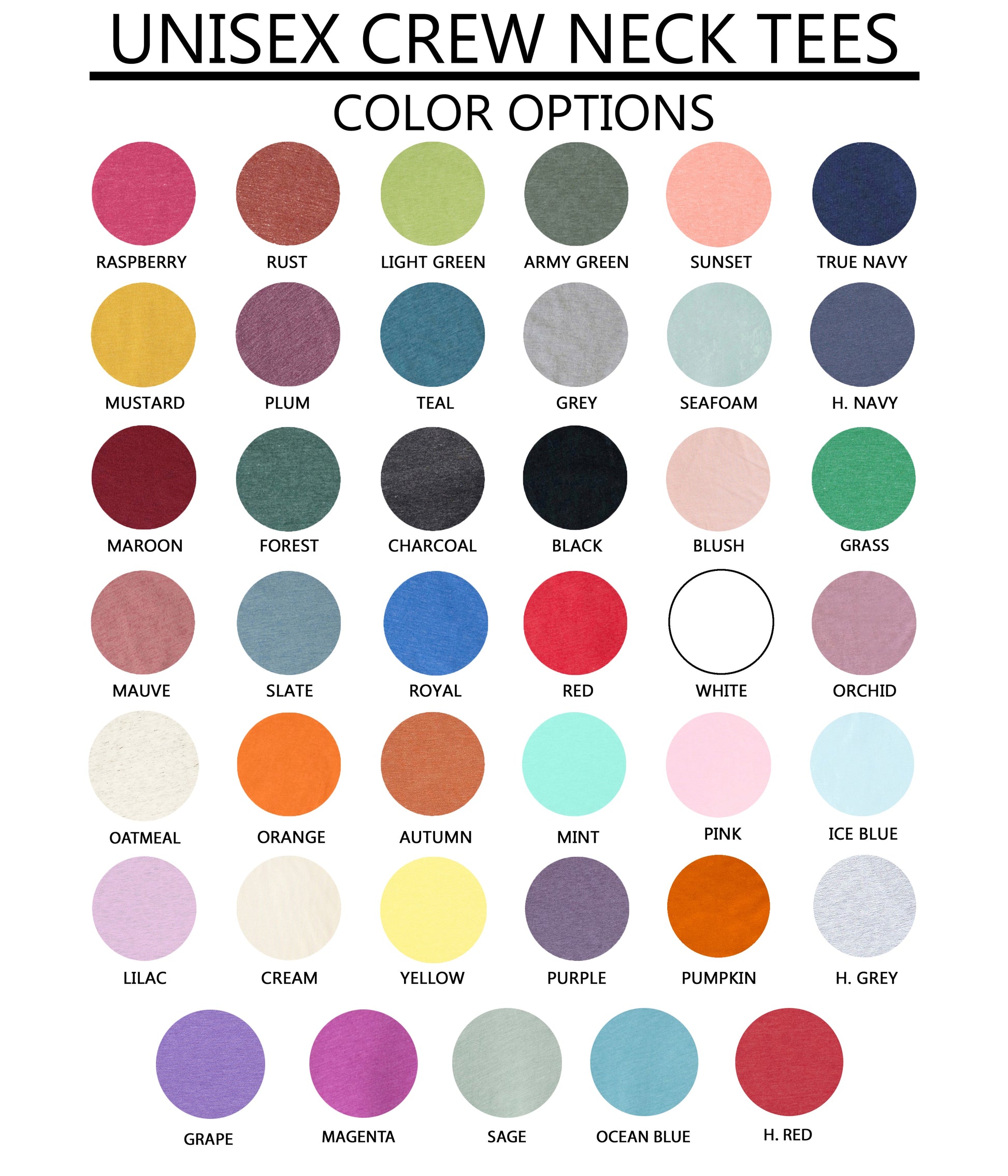 - Teal, Maroon, H.Navy, Plum, Charcoal, Raspberry, Forest, Rust, Slate, Sunset, Seafoam, Mauve, Blush, green Green, Royal, Mustard, Orchid, Autumn, Yellow, Mint, Ice Blue, Purple, Light Green, Grass, White, Magenta, Sage, Ocean Blue, Grape, H. Red, Cream: 52% Cotton, 48% Polyester